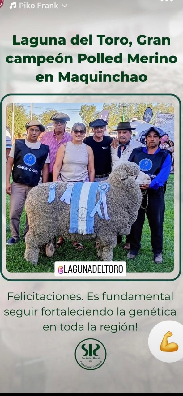 La Cabaña Laguna del Toro se consagró con el Gran Campeón Polled Merino en la Exposición Rural de Maquinchao, en la provincia de Río Negro, consolidando su trabajo genético y productivo en la raza. Carlos Otamendi, uno de sus propietarios, celebró el reconocimiento obtenido en una de las muestras más importantes de la región patagónica.