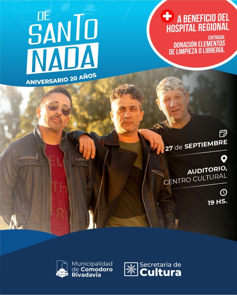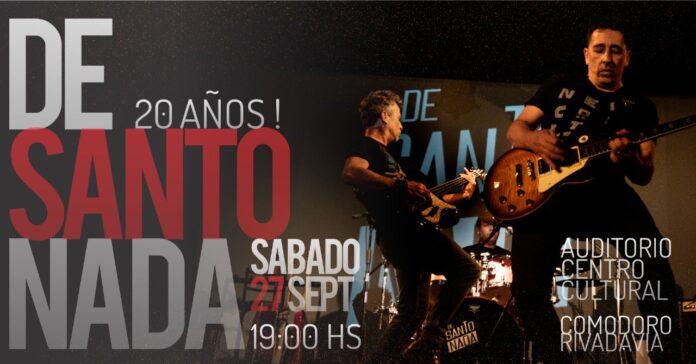 La banda de rock patagónico De Santo Nada cumple 20 años de trayectoria y lo festeja con un show solidario a beneficio del Hospital Regional de Comodoro Rivadavia. La cita será el sábado 27 de septiembre a las 19 hs. en el Auditorio del Centro Cultural.