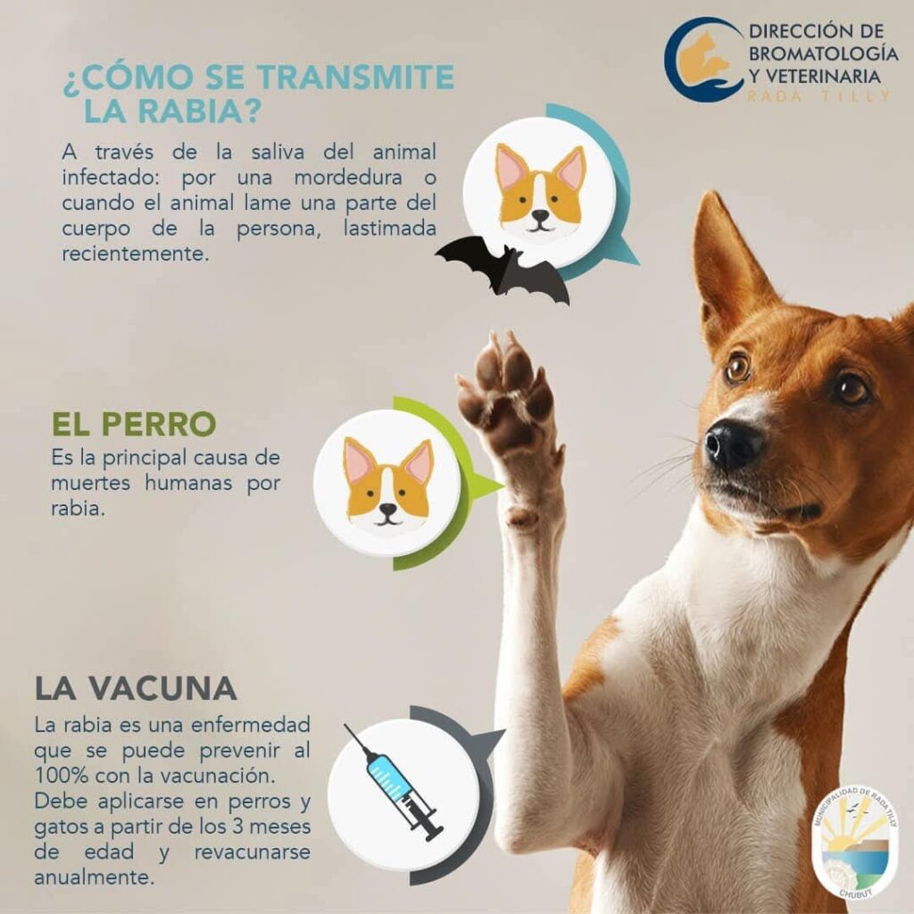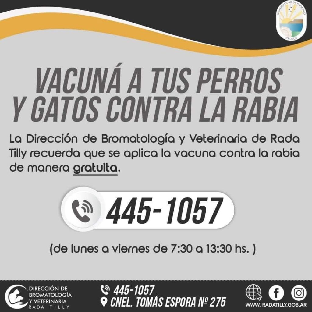 En el marco del Día Mundial contra la Rabia, este jueves 25 de septiembre, de 8 a 13 h, se llevará a cabo una jornada de vacunación antirrábica a domicilio, gratuita y con cupos limitados para residentes de Rada Tilly. 🗓️ Para sacar tu turno, llama al 445-1057 o envía un WhatsApp al 297-4000175.