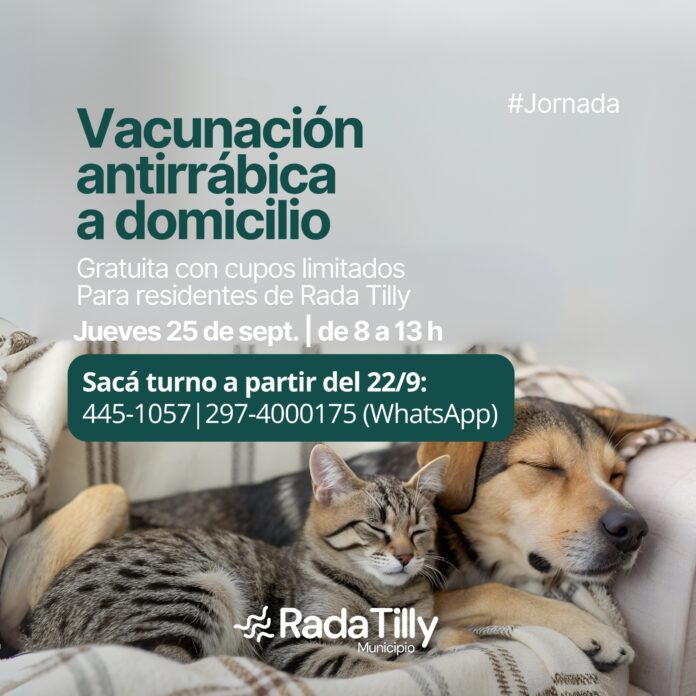 En el marco del Día Mundial contra la Rabia, este jueves 25 de septiembre, de 8 a 13 h, se llevará a cabo una jornada de vacunación antirrábica a domicilio, gratuita y con cupos limitados para residentes de Rada Tilly. 🗓️ Para sacar tu turno, llama al 445-1057 o envía un WhatsApp al 297-4000175.